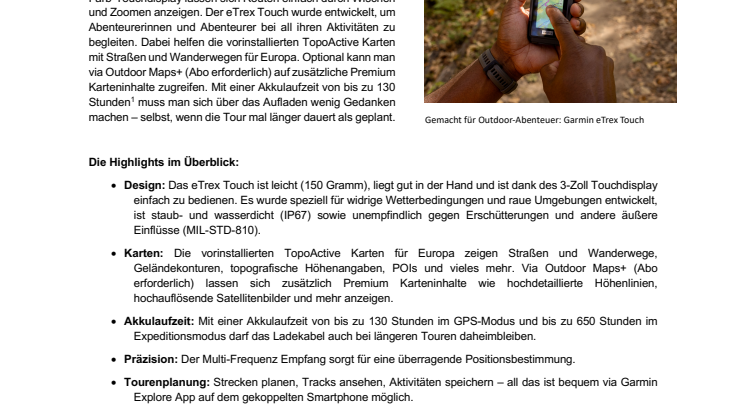 München, 30. September 2025 – Garmin stellt heute das robuste GPS-Handgerät eTrex Touch vor – speziell entwickelt für alle Arten von Outdoor-Abenteuern. Egal, ob zu Fuß oder mit dem Rad unterwegs, auf dem neuen, hochauflösenden Farb-Touchdisplay lassen sich Routen einfach durch Wischen und Zoomen anzeigen. Der eTrex Touch wurde entwickelt, um Abenteurerinnen und Abenteurer bei all ihren Aktivitäten zu begleiten. Dabei helfen die vorinstallierten TopoActive Karten mit Straßen und Wanderwegen für Europa. Optional kann man via Outdoor Maps+ (Abo erforderlich) auf zusätzliche Premium Karteninhalte zugreifen. Mit einer Akkulaufzeit von bis zu 130 Stunden1 muss man sich über das Aufladen wenig Gedanken machen – selbst, wenn die Tour mal länger dauert als geplant.