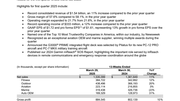 München, 30. April 2025 – Garmin schließt das erste Quartal 2025 mit einem Gesamtumsatz von 1,54 Milliarden US-Dollar ab. Damit verzeichnet das Unternehmen einen Umsatzwachstum von 11 Prozent im Vergleich zum Vorjahresquartal. Die Bruttomarge liegt bei 57,6 Prozent, die operative Marge beträgt 21,7 Prozent. Das operative Ergebnis in Q1 2025 beläuft sich auf 333 Millionen US-Dollar.