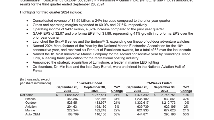 München, 30. Oktober 2024 – Garmin schließt das dritte Quartal 2024 mit einem Gesamtumsatz von 1,59 Milliarden US-Dollar ab. Damit verzeichnet das Unternehmen einen Umsatzwachstum von 24 Prozent im Vergleich zum Vorjahresquartal. Die Bruttomarge liegt bei 60,0 Prozent, die operative Marge beträgt 27,6 Prozent. Das operative Ergebnis in Q3 2024 beläuft sich auf 437 Millionen US-Dollar.
