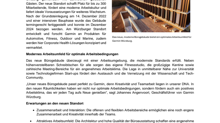 „Unser neues Bürogebäude passt perfekt zu Garmin, denn Kreativität und Teamarbeit liegen in unserer DNA. In den neuen Räumlichkeiten haben wir nicht nur optimale Arbeitsbedingungen, sondern fördern auch ein positives Arbeitsklima, das wir jeden Tag aufs Neue genießen“, sagt Johannes Angenvoort, Geschäftsführer von Garmin Würzburg.