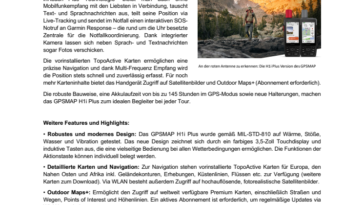 Das Premium Outdoor Handgerät GPSMAP H1i Plus ist ab sofort für 999,99 Euro (UVP) erhältlich. Ein Modell ohne inReach Plus Technologie, Kamera, Mikrofon und Lautsprecher (GPSMAP H1) ist für 649,99 Euro (UVP) erhältlich.