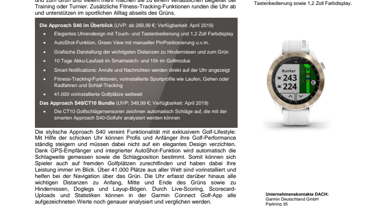 München, 21. März 2019 – Die neue Golfuhr Approach S40 ist durch ihre geschmackvolle Aufmachung mit Touch- und Tastenbedienung ein echter Hingucker. Umfassende Golffunktionen wie AutoShot, Green View mit manueller PinPositionierung sowie der Angabe der wichtigsten Distanzen zu Hindernissen und zum Grün und vielem mehr machen sie zu einem verlässlichen Begleiter bei Training oder Turnier. Zusätzliche Fitness-Tracking-Funktionen runden die Uhr ab und unterstützen im sportlichen Alltag abseits des Grüns.