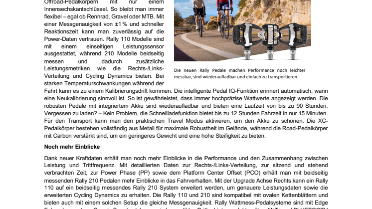 München, 09. September 2025 – Die Rally 110 und 210 Wattmess-Pedalsysteme liefern präzise Leistungsdaten und ermöglichen einen schnellen Wechsel zwischen Straßen- und Offroad-Pedalkörpern mit nur einem Innensechskantschlüssel. So bleibt man immer flexibel – egal ob Rennrad, Gravel oder MTB. Mit einer Messgenauigkeit von ±1 % und schneller Reaktionszeit kann man zuverlässig auf die Power-Daten vertrauen. Rally 110 Modelle sind mit einem einseitigen Leistungssensor ausgestattet, während 210 Modelle beidseitig messen und dadurch zusätzliche Leistungsmetriken wie die Rechts-/Links-Verteilung und Cycling Dynamics bieten. Bei starken Temperaturschwankungen während der Fahrt kann es zu einem Kalibrierungsdrift kommen. Die intelligente Pedal IQ-Funktion erinnert automatisch, wann eine Neukalibrierung sinnvoll ist. So ist gewährleistet, dass immer hochpräzise Wattwerte angezeigt werden. Die robusten Pedale mit integriertem Akku sind wiederaufladbar und bieten eine Laufzeit von bis zu 90 Stunden. Vergessen zu laden? – Kein Problem, die Schnellladefunktion bietet bis zu 12 Stunden Fahrzeit in nur 15 Minuten. Für den Transport kann man den praktischen Travel Modus aktivieren, um den Akku zu schonen. Die XC-Pedalkörper bestehen vollständig aus Metall für maximale Robustheit im Gelände, während die Road-Pedalkörper mit Carbon verstärkt sind, um ein geringeres Gewicht und eine hohe Steifigkeit zu bieten.